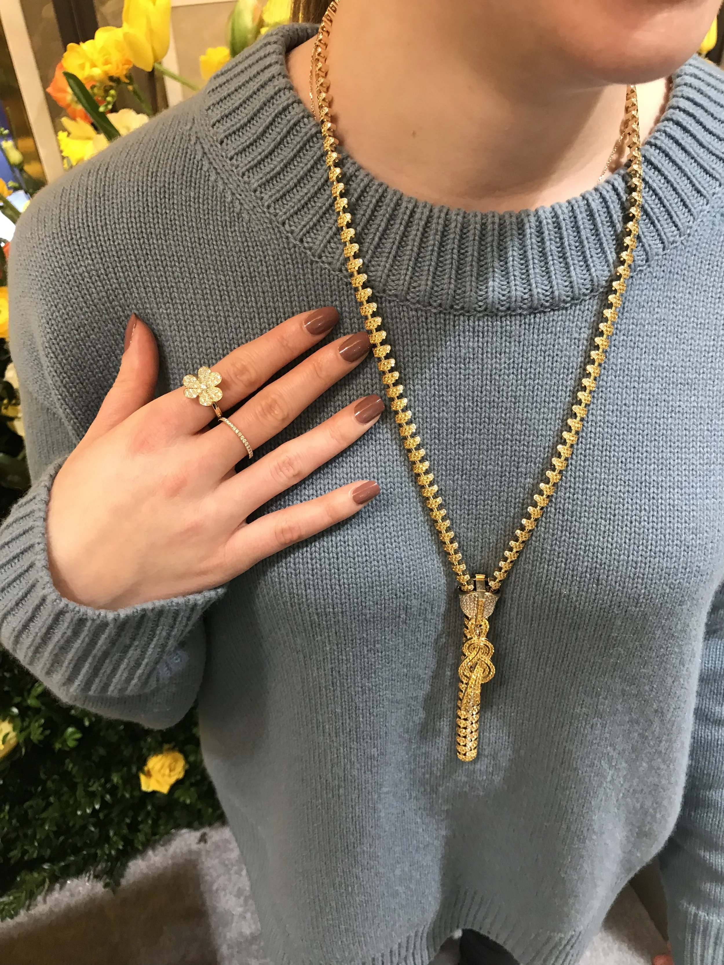 In May, I had the honor of attending a private event at the Van Cleef & Arpels store on Fifth Avenue to celebrate the beginning of Spring and the launch of the new Frivole collection. The event was held in a private room that had been transformed into a Spring paradise! There were colorful flowers spilling out of the walls and piled high like some sort of spring wonderland. It created a very welcome contrast to the terrible freezing cold rain that was going on out side—in May!